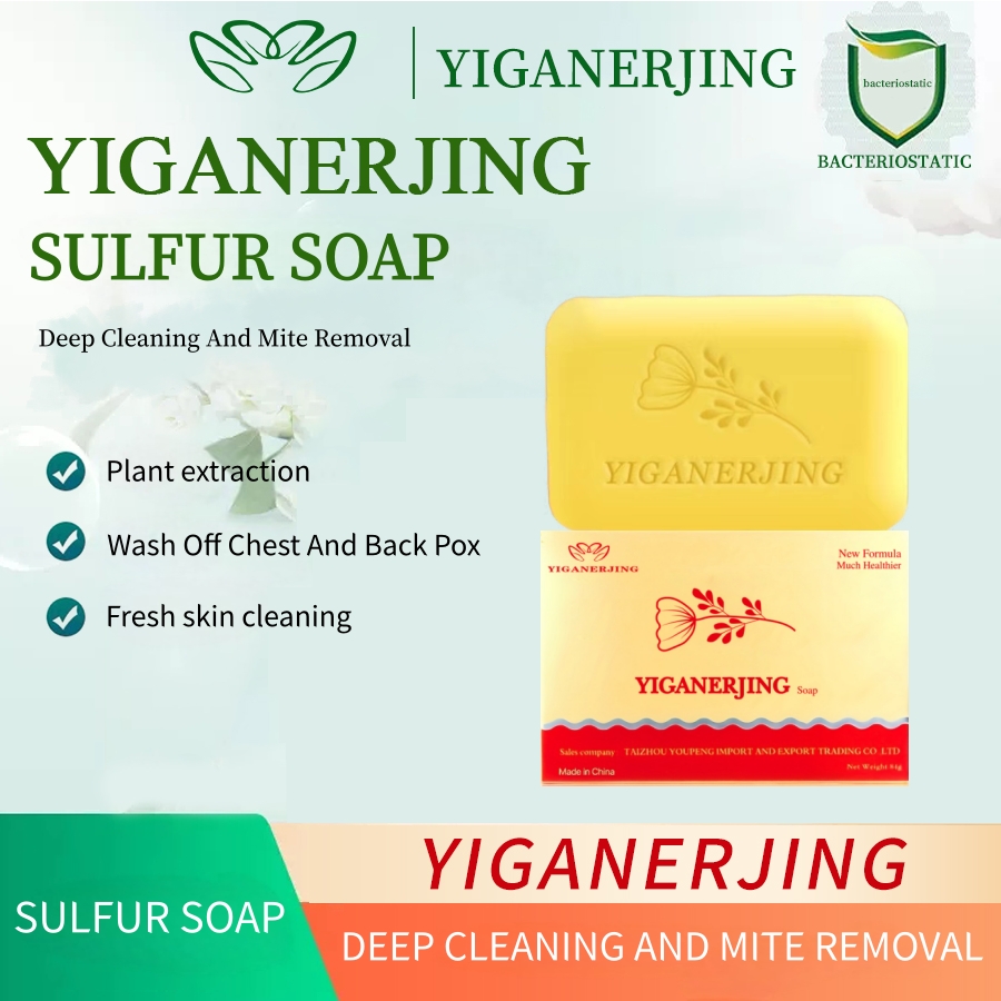 YIGANERJING Sulphur Soap is a classic brand with a unique sulphur formula that effectively treats acne and deep cleanses the face. It has natural antibacterial properties and refreshing and moisturizing benefits. This yellow sulphur soap removes excess oi